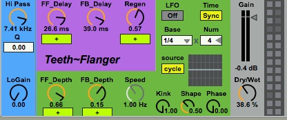 Flanger, based on Teeth~ with feedback and feedforward. LFO can be shaped, and synced. Hint: Feedforward is only audible at small delays if you mix it with the dry signal. |