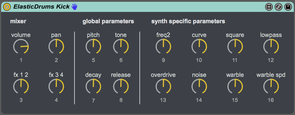 | Description: | These are some max devices to help control the great elastic drums iOS app via push. • Create a drum rack with an external instrument for each note / elastic drums instrument slot (1-6). • Use the external instrument device for sending midi to iOS. • Put the max device in front of the external instrument. • Assign different values (1-127) to each controller in the max device by clicking the number below the dial • Use the midi learn function in ElasticDrums to map the max device controllers to the app • In Push Bank1 shows mixer & fx parameters Bank2 the device specific parameters • Have fun! Find the ElasticDrums app app here https://itunes.apple.com/de/app/elastic-drums/id817419955?mt=8 |
