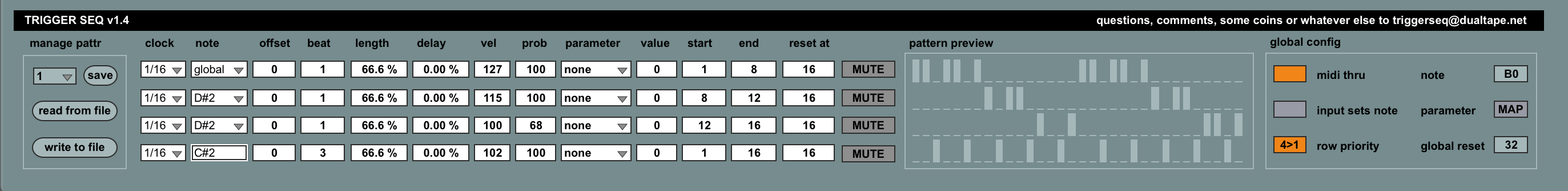 | Description: | v1.4 - shows visual pattern preview — v1.3 – completely new engine, coded from scratch (no more javascript, less cpu usage :) – individual clock per row – individual note per row – length and delay are now expressed in % and are adjusted related to the clock – adjustable row priority – adjustable global reset step count – parameter automation per row. it can send control change and mappable to live’s parameters — v1.2 – individual ‘reset at step’ per row – individual ‘delay’ per row – added start and end steps for triggering – added pattern save, bank dump to file and bank import from file — v1.1 – added ‘midi in sets note’ -> note will be set through midi input when turned on |