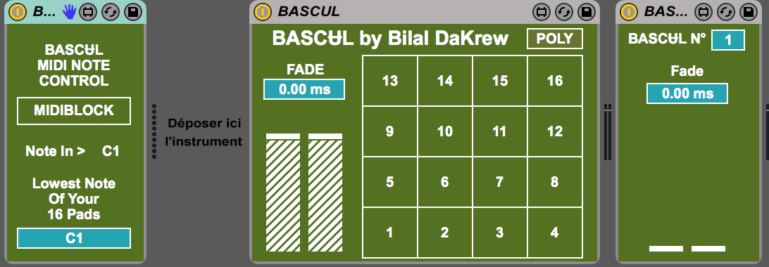 | Description: | Ces plug-ins vous permettent de switcher entre plusieurs sources/pistes Vous devez télécharger au moins BASCUL et BASCUL SLAVES pour l'utiliser BASCUL : se place sur la piste "maitre", elle sera réactivée à chaque fois que vous relacherez tous vos pads/touches BASCUL SLAVES : se placent sur toutes les pistes annexes régler chaque Slave sur un numero unique, la piste maitre sera mutée et la piste Slave activée en fonction du numero de Pad que vous avez pressé BACUL Midi Note Control : Vous permet d'utiliser directement votre controleur à pad ou votre clavier sans aucune assignation, réglez juste la note la plus basse que vous utilisez. Sinon vous pouvez assigner chacun de vos pads avec la méthode classque mais il vous faudra envoyer des CC pour conserver le déclenchement "momentary" qui fait l'attrait de ce plug-in plus d'infos : https://www.facebook.com/bilal.deledakrew |