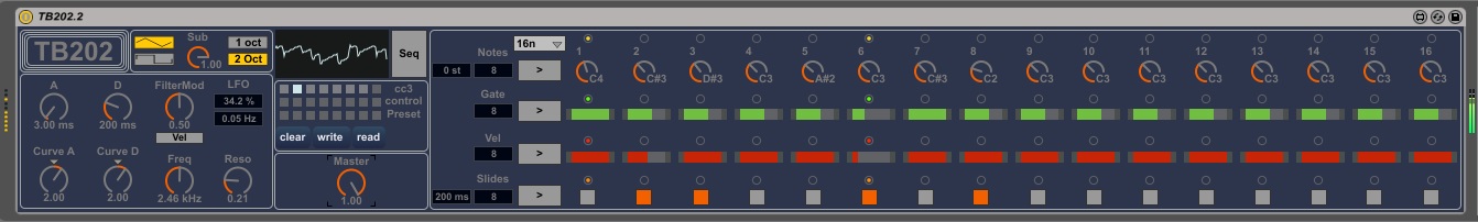 | Description: | hello, Here my TB202 an other bassline style synth. Is not a clone of TB303 is the original TB202!! :) There are an osc saw or square, an sub square -1 or -2 octave, an filter 24db, an envelope for filter, Lfo sine for filter. 4 sequencers, max 16 steps, eachs sequencers can have size and direction independent. One for notes, one for velocity, one for gate, one for slide. the sequencer work little bit like an arpegiator, an note of c3 and the sequence play like you've write. an note of c#3 up one semiton, an note b2 down one semiton, ect... all sequencers is reseted on new note. Do not support notes overlapped (sequence stop), if there is no space between notes the sequencers is not reseted. The velocity of incoming note affect volume. there are preset box, you can control preset with cc3. 0 for cc3 is preset 1, 1 is preset 2, ect.. If result is cool for you save preset before close set. sorry for my english and for this device :/ |