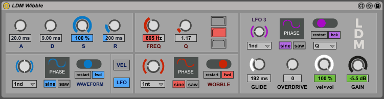 | Description: | Wibble is a monophonic bass synth designed originally for making wobble bass sounds. A customizable LFO controls the wobble of the frequency. A variable square oscillator is used which also has its own LFO or can be fixed or controlled by velocity. A third LFO can be assigned to different parts of the device, including the wobble LFO. Includes glide and overdrive. The device has no presets – Play with it and come up with something new! If enough people ask, I may include a preset section in a future update. This device is pay-as-you-like, so if you like the device and want to support my work you can leave me a donation. |