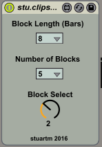| Description: | Rather simple device for selecting different parts of a clip to play, by parallel adjusting of start/end markers as well as loop start/end points. The aim was to combine several clips into a single one and "scroll" though them with a single MIDI controlled knob. If you know Octatrack SampleChains, you get the idea. - Works on both MIDI and Audio Clips. - Always affects the clip of the current scene within the track the device is located on - A selectable part of the clips is referred to as a "block" - All three parameters can be automated. "Block Length (Bars)" This dropdown selects how long the selectable blocks are. Can by 1, 2, 4, 8 or 16 bars "Number of Blocks" This dropdown selects how many blocks shall be selectable (1 to 8). The overall clip length has to be [BlockLength] times [Number of Blocks] "Block Select" This dial adjust to the number of blocks and can be used to "scroll" though the blocks. |