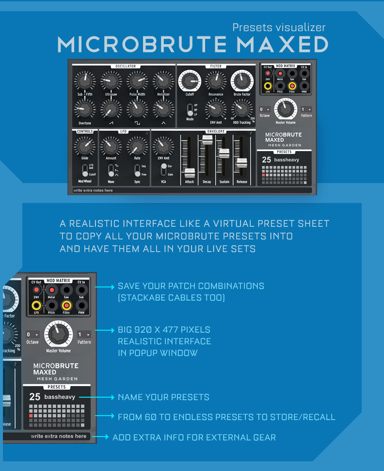 | Description: | Microbrute Maxed is a virtual preset sheet device for the Arturia Microbrute synth. It has the same old school style approach of the Microbrute preset sheets of paper, but instead of having holes and to be placed over your synth, it's a graphical realistic interface inside your Ableton Live projects. Featuring: - From 60 to endless visual presets to store/recall - Visualize traditional and stackable patches combinations in the Mod Matrix - Save preset names and extra informations for external gear |
