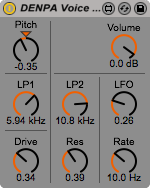 | Description: | Noisy Voice Changer In -> Pitch Changer -> Low Pass Filter 1 -> Overdrive -> Low Pass Filter 2 / Resonance / LFO -> Volume -> Out Pitch : Pitch Changer (-2~+2 Octave) LP1 : Low Pass Filter 1 Cutoff Frequency Drive : Overdrive LP2 : Low Pass Filter 2 Cutoff Frequency Res : Low Pass Filter 2 Resonance LFO : LFO Depth (LP2 Cutoff) Rate : LFO Rate |