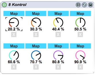 | Description: | Problem: macro controls are great but can only map parameters of devices on the same tracks (and not the ones from devices placed before them). 8Kontrol allows you to map parameters from any device regardless of their location in your Liveset. You can centralise all parameters you need to control. Next version will modify the Live Dial unit based on the mapped button. NOTE: sometimes the mapping doesn't work after the first try, just insist until it works... For info, this maxforlive audio device is based on the MapButtonLFO.maxpat Feel free to use it and modify it if you want. |