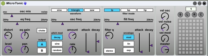 | Description: | Yet another m4l device for Sonic Charges MicroTonic. This one tries to replicate the UI of the original device. It provides randomization and it can save a bunch of presets. Included in the dowload is the max device, a drumrack and a MIDI map you should load into MicroTonic via its MIDI preferences. V1.1: Bugfixes, added toggles to include/exclude parameters from randomization, updated drumrack |