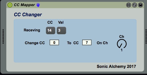 | Description: | Convert a CC control stream from one value to another. Great for mapping CC values to manipulate an external synth or equipment that needs to receive a specific CC value on a specific MIDI channel. Receiving shows you the CC data that is being received. Change CC : set the value of the CC you wish to change. To CC : set the value of the output CC. On Ch : set the MIDI channel you want to sent the CC data on. Verion 1.1 Full MIDI Channel support 1 thru 16 |