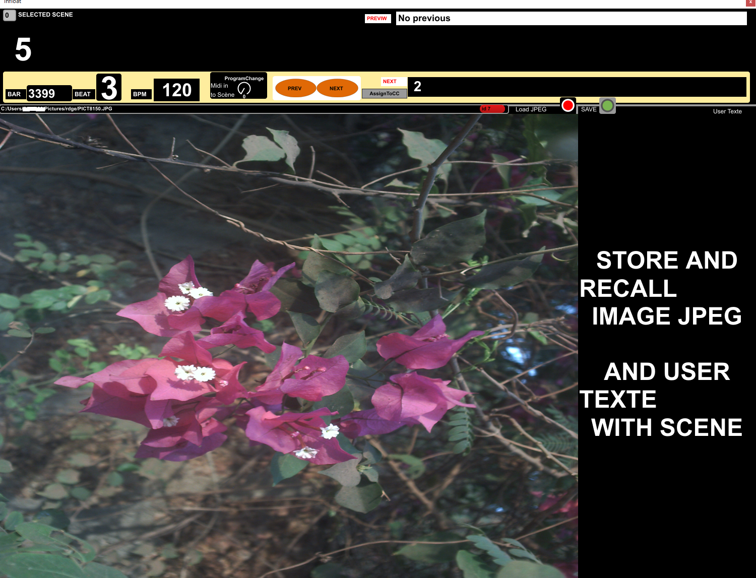 | Description: | Scènes Kontrol Monitor Monitor scene name: curent, next, preview, PERSISTANT SAVE ET RELOAD IMAGE JPEG AND TEXTE WITH SCENE YOU CAN REORGANISE SCENE ORDER WITOUT LOSE JPEG AND TEXT Put on midi track just select a scene , clic load ,choose image in PC type a text on right and clic save .. you can change image or text any time just clic save ------------------------------------------- receive MIDI IN PROGRAM CHANGE from midi keybord to recall SCENE ((block ProgChange = do not send to instruments rack and vst in a chaine )) and ASSIGNABLE PREVIEW NEXT SCENE PROG CHANG 0 IS ALWAY TRIG FIRST SCENE progchange 3 always trig scene 4 independently to her name now , you can drag and reorganise scene to assigne scene at a specifique external midi Program Change so only firts 128 scènes is usable with Program change prog= 0 to 127 --------------------------------------------------- Button assign to midi note or midi CC ((no noteoff)) if your controller need:: double clic to work corectly or clic once jump two scene when clic ""inc /dec "" from contrroller try another .. button position is save with ableton --------------------------------------------------- Revisited patch from zangpa http://www.maxforlive.com/library/device/449/trigger-scene |