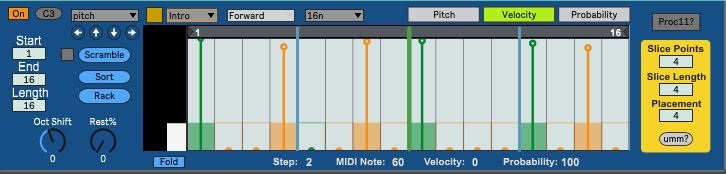 | Description: | Hi, This is a basic sequencer with a focus on drums. There are 4 sequences (Intro, Verse, Chorus, Outro), each of which can be up to 64 steps. The Rack button redistributes the note pitches linearly from C1 up to the Length. This is mostly for Drum Racks of up to 64 slices or if you play a Simpler drum loop in Slice Mode (or "slice to drum rack"). Scramble reorders the chosen pitches and the button next to it auto scrambles on each loop (set by Start, End). The Proc11? button turns on my attempt to simulate and midify the incredible Livecut/Bbcut Proc11 audio processor. It basically slices up the midi pattern and then lays out the slices in different orders. Maybe it is more like the MAM SQ16? I think it works best when all the Proc11 parameters (in Yellow) are a multiple of 2, but I really have no idea. Enjoy Update: The main new feature here is the bright orange button next to the Intro, Verse, Chorus, Outro (IVCO) menu, which I call the Section menu. When the new, bright orange button is off, this sequencer is not being controlled by the new, unseen force of the global IVCO sequencer found here https://maxforlive.com/library/device/5625/introversechorusoutro |