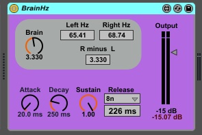| Description: | Hi, This is a binaural, brain wave synthesizer. It only uses sine waves. I've done other versions with all the other basic waveforms, but they don't sound as good as pure sine. The Brain knob sets the frequency (0...42 Hz,) of the binaural brain wave i.e. the difference in frequency between the left and right ear (each ear hears a pure sine tone). The pure frequency of the left ear is controlled by the incoming midi pitch. The pure frequency of the right ear is the left ear frequency plus the Brain Hz offset. Your brain then synthesizes the Binaural Beat at the Brain Hz frequency. The binaural, brain wave effect is supposedly only felt through headphones. For some reason, I like to quantize my Release values to musical durations (8n, 4n, 2n ...) but you can also adjust it manually to the ms. Enjoy |