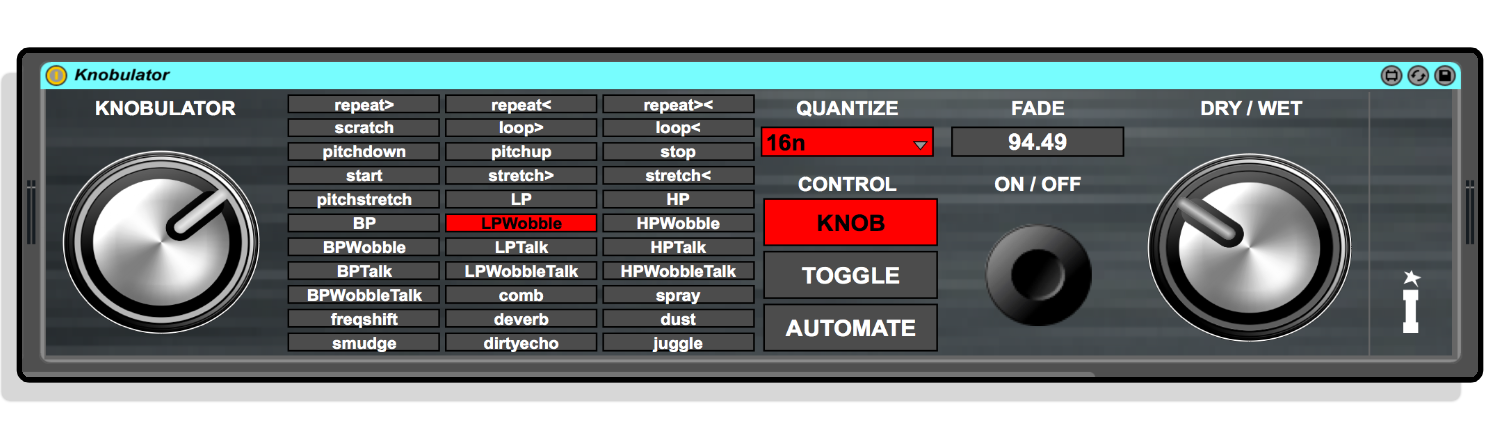 | Description: | KNOBULATOR The Knobulator is a MaxForLive device for mashing up audio in realtime. Turn the knob and the effect comes on, stop turning it and it turns off. Fantastic for live performance as well as audio productions. It’s parameters automatically map with the Blue Hand control of supported Live MIDI controllers like the AKAI APC40. Turn your beats into wabbly crunchy glitches, run some synths through it for instant wobble. The Knobulator is a performance based multi effects device for performing beat based, quantized effects with minimal fuss and complete ease of use. What makes it unique from any device like it is the way effects are triggered. You simply turn the knob, from any position, and the effect is active, keep turning to adjust the effect, then stop turning to disable. Simple. You can set the qunatize for not only the timing the effect is launched, but also the sweep of the knob thats modulating it. You can change the effect in realtime whilst turning the knob too, to create exciting glitch effects that will explode. Beat repeats, stutters, reverse, tunrtable effects, filters, bit reduction, delays, grains, they’re all there, ready go to without mappinh anything. Great for djs looking for intersting things to throw into their mixes, or mashup dudes looking for something quick and easy with still loads of control. A popular choice! WALKTHROUGH VIDEO - https://isotonikstudios.com/ned-rush-glitch-pack-update-knobulator/ |