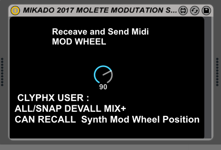 | Description: | Receive Midi IN Mod Wheel from Midi Keybord and and Add Abillity to CLYPHX USER ALL/SNAP DEVALL MIX+ CAN RECALL MOD WHEEL POSITION to synth ------------------------------------------------- can also use with this http://www.maxforlive.com/library/device/4287/mikado-clyphx-snap-save-rec-position and this if you have Instrument RAck With Chaine selector to also recall Chaine Selector http://www.maxforlive.com/library/device/4082/mikado-chain-selector-2017 |