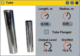 | Description: | Puts the input sound at the end of a tube with settable length and radius. The tube can be "flanged" (like an opening in a wall) or unflanged (like a didgeridoo) which makes a subtle difference. I've tried to be as physically accurate as I can in the modelling - see notes in the patch. For anyone interested, one of the sub-patches (FIRGen) produces a linear-phase FIR filter with settable gain - you write a patch that takes frequency in and outputs the gain, and it produces the filter. If that doesn't mean much, forget it - hey, it's a tube. |