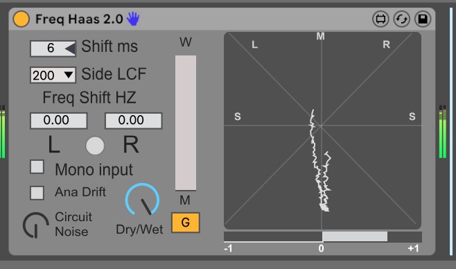 | Description: | Yes! It another stereo expander. But this time it uses HAAS effect together with micro frequency shifting for more natural result. Works well on vocals and some synths sound. Also to not to make some simple device I added to it analog drifting, emulating old gear plus analog noise working with this section. 2.0.1 Fixed recall and some small bugs 2.0 Added width control, Goniometr Reduced size Fixed missing file 1.2 Side Low Cut Filter 1.1 GUI updated to Live 10 |