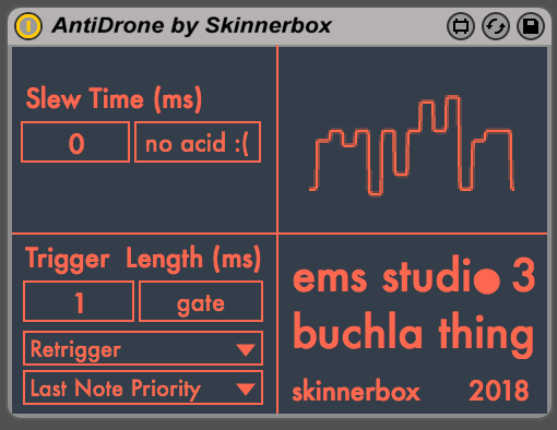 AntiDrone is essentially a midi to cv device calibrated for the buchla 258 oscillators in EMS (studio 3) you will need a MOTU audio interface in order to use it, the left channel is outputs CV whereas the right outputs gate or trigger. it also features auto glide so you can go acid and be happy. note that you need a minijack to banana adapter. |