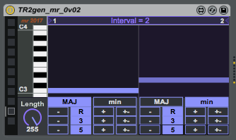 | Description: | TR2gen_mr is a 2 step sequencer. Just two steps, each one bar long, and all it does is generate 2 chords (separated by a fixed pitch interval) made up of major or minor triads, so producing three sustained notes in each bar. You can set the pitch of each chord, if it is major or minor, if you want fixed or random inversions to be applied to the three notes, and how long the notes last. Simple - but a great idea generator! This article links to some of the background theory (two excellent YouTube videos): https://hitrecord.org/records/3124715 There is more information on basic arrangements for instrumenting the output, plus another free utility, in my blog: https://synthesizerwriter.blogspot.co.uk/2017/12/two-step-two-bar-triad-chord-film-music.html SoundCloud Demos: https://soundcloud.com/martinruss/tr2gen-mr-0v01-m7m-demo01 https://soundcloud.com/martinruss/tr2gen-mr-0v01-m2m-demo02 https://soundcloud.com/martinruss/tr2gen-mr-0v01-m5m-demo03 https://soundcloud.com/martinruss/tr2gen-mr-0v01-m10m-demo04 User Demo: Ego Likeness has produced a video showing TR2gen in use: https://www.facebook.com/Stevenlikeness/videos/10214862813994117/ (I love the use of Kaoss pad controllers live!) .amxd file? Instructions for what to do with the .amxd file that you download from MaxForLive.com, are here: https://synthesizerwriter.blogspot.co.uk/2017/12/where-do-i-put-downloaded-amxd.html |