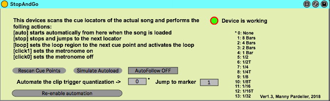 | Description: | Arrangement goes Session. With this device you can automate the arrangement view with cue locators. Simply name the locater e.g. [stop] or [loop] and the actions are set. Additional feature: AutoFollow (take the Follow-Function always on), automation of the clip quantization AND now in v1.3 function "Jump to marker" and "Re-enable automation"-button. |