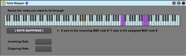 | Description: | Filter incoming MIDI notes and then map those notes to whichever you'd like. Useful for live setups. Very ugly, simple, quick device I made this morning for my setup Click the notes you want to let through on the piano keys. Map note # to another note # via the lookup table better stuff: dillonbastan.com |