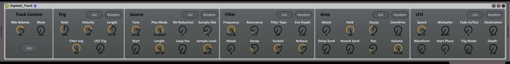 | Description: | Control your Elektron Digitakt from Ableton Live This is a pack of two devices, one to control each audio track of the Digitakt and one to control global FX and pattern change. - Song mode (via pattern change messages) - Control all the track parameters of the audio channels - Control all the FX parameters on the delay and reverb page - Send pattern change messages based on bank/pattern - Init and set random values for any values You can of course automate all of these, attach LFO's to them etc. |