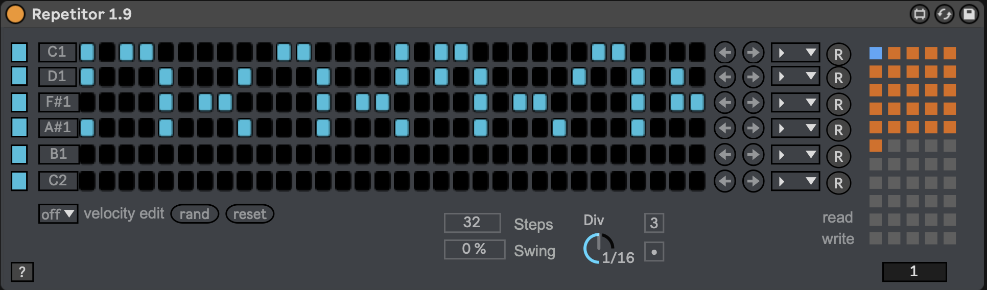 Thank you for this device and the updates. I'm using it as a simple drumrack sequencer. I know this device is meant as a Zularic Repetitor clone but the device would be perfect if there was a random button for each of the lanes to randomly generate patterns.