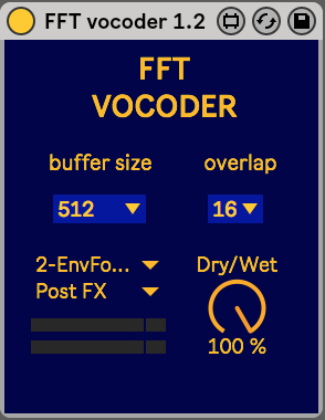 | Description: | With the advent of multi-channel routing capabilities in Ableton 10, I thought it was high time for a neat little FFT phase based vocoder. Simple, but very effective! To set it up simply put it on the audio track to be 'vocoded' and select the carrier channel and insertion point. You can play around with the buffer size and overlap. Low buffer sizes and overlaps will make things more grainy and dirty, with a lower CPU load and a fast reaction time, while higher values will keep things crisp and crystal clear, but will demand more. The buffer size determines the amount of latency as well. For those who care: I tried to keep to the m4l 8 standard as much as I could regarding the approach to wet/dry, audio routing and so on. Hope you enjoy! If you encounter a problem, have a question, or just want to say hi, you can find my contact details inside the device ;) p.s.: IMPORTANT: this device will only work from Ableton 10/Max 8 onwards, as it uses the new routing system! Update 1.1: - fixed bug that prevented the parameters from loading up properly after saving and reloading a liveset. - fixed tiny bug turning the volume sliders of each copy of the device to grey when one of them was deactivated Update 1.2: - changed name from "Phase Vocoder" to "FFT Vocoder": although it is a vocoder making use of the phase of FFT bins, an actual phase vocoder is a different thing altogether, and has a different use and functionality from a classic vocoder - slightly less CPU-heavy, should be less prone to any crashes too - fixed bug that could stop the device from working upon loading in a liveset until changing the buffersize or overlap parameters |