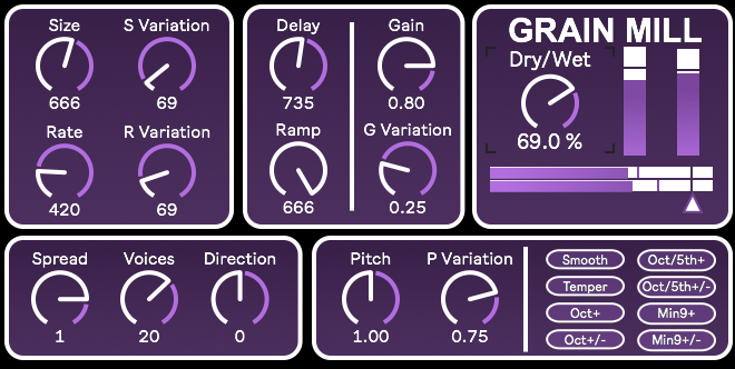 | Description: | This is just your run-of-the-mill granulator audio effect. I made it a good while ago and haven't updated it in some time, but I still find myself using it fairly regularly. Maybe someone else might like another one of these things. The Grain Mill uses the brilliant munger~ object created by the generous Perry R. Cook and Gary Scavone. The function of the device is simple enough. Here's a quick rundown of the parameters: Size: How many milliseconds each grain lasts for. S Variation: How many milliseconds variation there is for each grain. Rate: The space between grains in milliseconds. R Variation: How many milliseconds variation there is for the rate. Delay: How large of a delay buffer is accessible for the grains. If the delay buffer is smaller than the grain size, the grains will only be as big as the delay buffer allows. If the delay buffer is much larger than the size, the grains will be created from any time as far back as the buffer allows. Ramp: The milliseconds of volume ramping that smooths out the beginning and end of the grain instances. Higher values will create smoother sounding grains, and lower values will create quicker volume ramps (with a low ramp being potentially clicky). Spread: Stereo spread for the grains produced. Voices: How many voices of grains are being produced simultaneously. Direction: The direction of the grains produced. (-1 is all reversed grains, 0 is reversed and forward grains, and 1 is only forward grains.) Gain: The gain value of each incoming grain. G Var: The gain variation to individual grains. Pitch: The fundamental pitch of the grains outputted. In almost all cases, it's best to leave this at 1. P Variation: The amount of pitch deviation from the original grain. NOTE: These two values are a bit more complicated than they seem, and may require some getting used to. Also, the buttons in the lower right impact these. More on that shortly. THE BUTTONS: At the bottom right, there are eight buttons. I created these for articulating the pitch variations. Smooth: The pitch variations will be completely random in frequency variation. Temper: The pitch variations are closer to a tempered relationship from one another. Oct+: This will randomly produce grains an octave above the incoming pitch. (The higher the P Variation knob, the more likely the random octaves will be generated.) Oct+/-: This will randomly produce grains an octave above and below the incoming pitch. (The higher the P Variation knob, the more likely the random octaves will be generated.) Oct5th: This will randomly produce grains a fifth and an octave above the incoming pitch. (The higher the P Variation knob, the more likely the random fifths and octaves will be generated.) Oct5th+/-: This will randomly produce grains a fifth and an octave above and below the incoming pitch. (The higher the P Variation knob, the more likely the random fifths and octaves will be generated.) Min9+: This will randomly produce grains a fifth, an octave, and a ninth above the incoming pitch. It's more of a sus2 variation. (The higher the P Variation knob, the more likely the random intervals will be generated.) Min9+/-: This will randomly produce grains a fifth, an octave, and a ninth above the incoming pitch. It's more of a sus2 variation. (The higher the P Variation knob, the more likely the random intervals will be generated.) NOTE: All of the above work best with the Pitch dial at 1 exactly, only using the P Variation to adjust the harmonic output. Naturally, there's also a Dry/Wet dial and, below that, a master volume for the output. There's also a couple meters showing the dry and wet volumes to the right because, I'll be honest here, I needed to waste some space. NOTE: I just put out an updated version of this patch, so you can probably just ignore this one. thx |