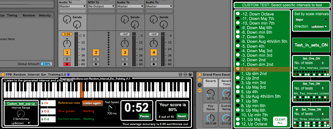 | Description: | Random Interval Ear Training is a Max for Live MIDI device designed to test and improve aural intonation. Place this device behind any MIDI instrument and play or click in a reference note. The device will randomly generate another note up to an octave / 12 semitones away and you have to play back that same note to score a point. Repeat until ready to stop, following the instructions in the top left corner of the device. Includes a timer and points tally for your enjoyment / reference. v1.01 mouse click notes are now always velocity 100 v1.02 added average accuracy and minor display changes. v1.1 Added a pop up for more advanced test settings. You can now select specific intervals to test or set intervals by scale, set a test routine and control the test speed. Alternatively use it just as you did. bug: sometimes having to press reset to start the device after loading |