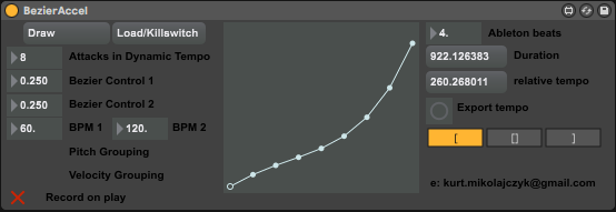 This works in much the same way as my devices "Geo Calc" and "N-1 Dynamic Tempo", but uses a cubic bezier curve to make an accelerando in midi notes. If you're into polytempo you can find some useful information on how the maths for this particular plugin works here: http://polytempo.zhdk.ch/publications/Kocher2016.pdf