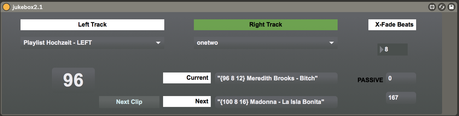| Description: | Autoplay Clips in Live. Choose two tracks (left + right), hit play on the first clip and this M4L app will automagically launch the next clip. Features: * Prepend clip names with tempo, intro + outro # of beats * Smoothly adjusts tempo from one clip to the other Example clip names: {100} Artist - Nice Song {120 16 32} Another one - 16 beats intro and 32 beats outro Todo: * add track volume control to fade in new songs Note that this is the very first device I ever built in Max and it's kind of beta! Suggestions and improvements welcome! Cheers, Steffen |