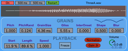 | Description: | Hi Folks, This is a slimmed down version of my Grainery midi instrument, which is based off of Brendan McCloskey's incredible Granary Max Project found here https://cycling74.com/projects/granary-a-hybrid-granulation-engine It offers time-stretching independent of pitch, as well as pretty smooth click-free scrubbing, pitch randomness, Inter-Onset-Interval and other grain controls. You get an On/Off button and associated Fadein/Fadeouts for a simple envelope (you need to have Live playing to hear it). The times next to the On button determine the Fadin and Fadeout when you turn it on and off. Drop a sample onto the grey area and twiddle. Enjoy. Update: I had to change the Start number box from milliseconds to percent. It works better now. Update: I put the Restart button back in. When enabled, this starts the sample from the beginning whenever you turn it back on. Otherwise, it just picks up at wherever it happens to be. |