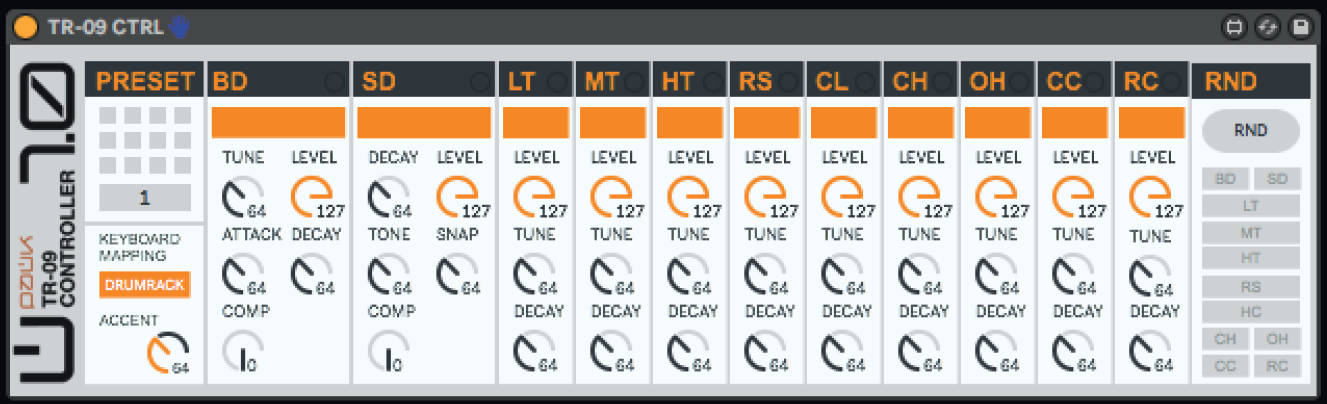 | Description: | TR-09 CTRL is a midi m4l device to control the Roland Boutique TR-09. The UI is pretty close to the hardware, i’ve just added a preset manager, a drumrack mapping option and a ‘per part’ randomizer. The Preset storage section can save up to 12 presets within the Live project. Click to LOAD Shift + Click on a slot to SAVE Shift + Alt + Click to DELETE The Keyboard mapping option changes the mapping between the original mapping and a consecutive mapping, perfect to be used in a drumrack. Included is a Drumrack preset with the device ready to be used in Live 10 The last device on the Drumrack is a Ext.Instrument device, be sure to route the midi input and the audio input correctly in order to use it right. And inally there is a Randomize section where you can deine where the randomization aect by sounds: BD, SD, LT, MT, HT... The device is updated with the hardware changes, so you can inetune the preset from the hardware and these changes will be relected on the patch (the track needs to be armed and the input routed from the TR-09 to respond). Don't hesitate to contact me if you ind any problem or if you have an idea to update the device :) |