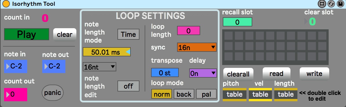 | Description: | Isorhythm Tool is a Max4Live midi effect device, a hybrid sequencer/arpeggiator designed to record/compose in real time midi loops with different rhythmical/metrical qualities. It runs independently from the time signature of the Ableton project, but in sync with it’s time. It is a real-time composition tool and it sounds more musical then step-sequencers or other arpeggiators, because loops are recorded with their natural note velocities when played by musician as opposed to being manually set via mouse. The name comes from the term “Isorhythm” - which is a compositional or rhythmical term in music, first introduced in Western Music composition by Guillaume de Machaut in XIV century and was used in composition of Motets. The main idea is to create a very long non repetitive structures when overlaying short loops of the same note rhythm values but different length. For example laying a loop of 5 - quarter notes notes over a 4/4 beat will repeat it’s cycle only after 20 bars. Instructions on how to use are "inside" the device, press the edit button and scroll down. Demo video: https://youtu.be/fmdiVr3wbYI If there are any bugs and /or suggestions for the future development of the device, - please feel free to write me an email: Ms.Psyjazz@gmail.com |