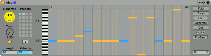 | Description: | Aicd is an acid pattern MIDI generator Max for Live device based on a maximum likelihood n-gram model. More info at the GitHub repo (see link below). Demo at https://youtu.be/y58dpdHuVms v1.1: Add clip creation v1.2: Add separate, MIDI mappable generate button v1.3: Add output clip, play toggle v1.3.1: Add MIDI thru v1.4: Add pattern rotation v1.4.1: Add MIDI mappable preset recall v1.5: Update for Live 11 v1.5.1: Fix step calculation bug |