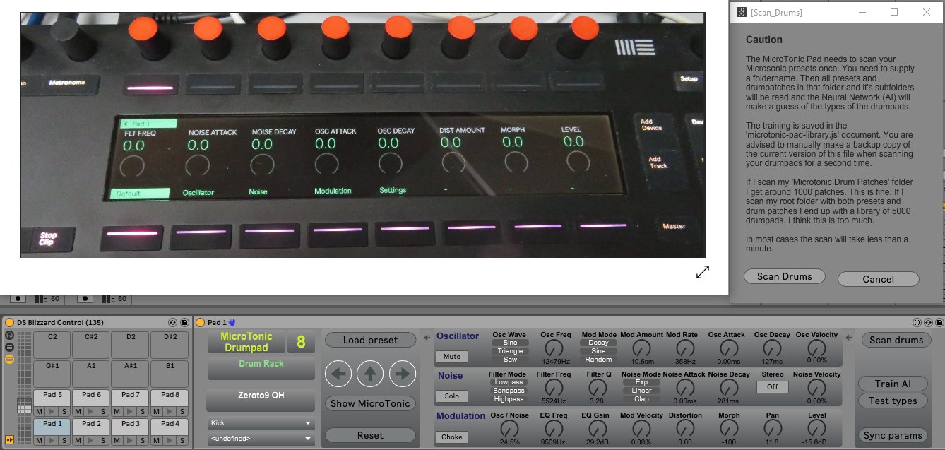 | Description: | I like the MicroTonic drums from Sonic Charge a lot. You can get almost any drumsound from the same drumsynth. For each drumpad 23 parameters can do the job. It’s about 15 years old now, but I don’t think it shows it’s age. Ableton Live is my main DAW. Ableton’s Drum Rack can be used easily from my Push 2. Through the years I’ve tried several times to integrate the MicroTonic into a Drum Rack. Finally I’m content with this approach which allows the use of standard MicroTonic presets and integrates the parameters for use from the Push2. There are more devices for the MicroTonic here on MaxForLive.com, but I think there is room left for one more. This package comes with some usefull extra features. Copyright This package is freely available for download ‘as is’. Although I’ve spent a lot of time constructing this device I decided not to make it commercially available. You can use it as you like. The code is open and can be changed in the MaxForLive editor to your liking. However I ask you not to distribute your own altered versions. Instead please ask me to integrate your code into my device. That way there will only be one codebase for it. The downside of this is that I will only provide minimal technical support if you have issues using the device. To do list - There is an issue Ableton Live will crash when closing with active MicroTonic Drumpads. To avoid this you can delete the drum rack before closing Ableton. I will report this issue to Cycling ’74. - The neural network is using an old version of the brain by Heather Arthur. This needs to be replaced by a recent version. However the AI is doing it’s work reasonably well. Installation First you need to unzip the downloaded file and find a nice place for it on your computer. Then add this to ‘Places’ in Ableton Live. You need to place your own ‘Microtonic Multi.dll’ file into the VSTi subfolder. If this doesn't work for you you can manually select your plug-in. Operation You can drag the Microtonic Drumrack.adg into your Ableton song. This gives you 8 identical drumpads. Each drumpad has an embedded MicroTonic VSTi inside. The first pad of these are used for making a sound. For loading presets the pads must be placed on the notes C1 to G1. You can load as many MicroTonic drumpads or other drumsounds into the drumrack as you like. Documentation This package comes with a user manual and a technical reference. |