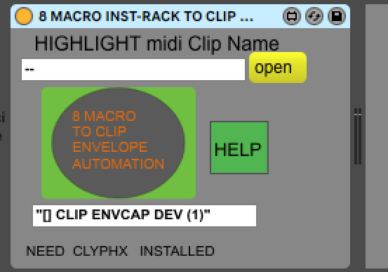 | Description: | WRITE STATE OF SELECTED DEVICE TO HIGHTLIGHT SELECTED CLIP : this patch need "clyphx Pro" installed AS MIDI SCRIPT AND USE "" [ ] CLIP ENVCAP DEV °° FUNCTION ______________________________________________ HOW TO USE = PUT THIS PATCH ON DEDICATE AUDIO OR MIDI TRACK ASSIGN BIG BUTTON TO MIDI CONTROLLER BUTTON OR KEYBOARD SHORTCUT AND YOU CAN REDUCE TRACK NO NEED RETURN TO IT ... WHEN YOU WANT WRITE 8 MACRO TO CLIP ENVELOPE AUTOMATION JUST CLIC SELECT MIDI CLIP HIGHTLIGHT FOCUS ON ANY TRACK AND EVERYWHERE MAKE SUR RACK IS SELECTED AND CLIC BUTTON YOUR JUST ASSIGN ¨¨¨¨ SO ON CAN ADD ENVELOPE OF ANOTHE PLUGINS TO TRACK .. JUST CLIC SELECTED PLUG AND CLIC BIG BUTTON SO ................................. PRINCIPE= (((( THIS PATCH RETAIN THE NAME OF CLIP SELECTED RENAME THIS AS [[ ]]CLIP ENVCAP DEV(1) TRIG THE CLIP TO CAPTURE ENVELOPE AND RENAME AS ORIGNALE NO NEED RENAME MANUALY AFTER CAPTURE TO AVOID WRITE PERMANENTLY TO CLIP AND SO DESARMED AUTOMATION EATCH LOOP PLAYING ))) CLEAR ENVELOPE SELECT DEVICE AND CLIP WHERE AUTOMATION YOU WANT TO CLEAR AND CLIC CLEAR BUTTON °°°°°°°°°°°°°°°°°°°°°°°°°°°°°°°°°°°°°°°°°°°°°°°°°°°°°°° WARNING !!! WRITE STATE DEVICE TO CLIP RESET AUTOMATION ACTUALY IN CLIP SO REMEMBER WRITE STATE DEVICE TO CLIP BEFORE RECORD AUTOMATION MOVEMENT PARAMETER WRITE STATE TO CLIP NO WORKING WHEN RECORD CLIP AUTOMATION |