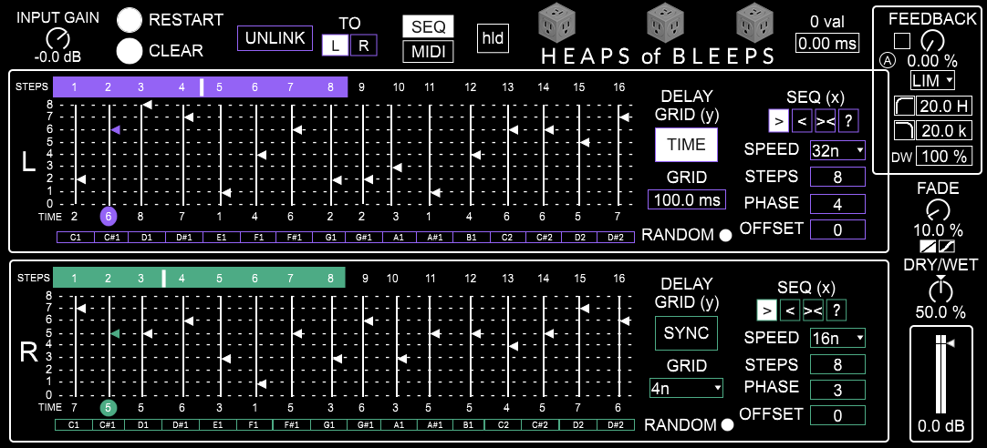 | Description: | This new device by Heaps of Bleeps is a deluxe version of the Sequential Delay, our first device. This audio effect allows you to sequence the delay of the audio of the left and right inputs with 2 independent 16 step sequencers which can be run internally like a normal sequencer or triggered by MIDI notes to create very customizable delay sequences. No chirps or clicks when switching between delay lengths (unless you want them), and accurate timing when switching between delay lengths. Control of the fade between the steps of the delay. You can create buffer shuffler-like sounds and shape the scrambled audio with the filter section and then feed it back into itself. You can also get some interesting sequenced comb filter effects with the low delay times and high feedback. Demo Videos: Drums: https://www.youtube.com/watch?v=reVrvSjxbtk&t=324s Synth (midi mode): https://www.youtube.com/watch?v=Tu0ZrI7lsX4&feature=youtu.be Now available in the Delays and Harmonizers pack. http://www.heapsofbleepsaudio.com/p/packs.html Overview of Features (*=new) The Sequencer: -16 steps for each channel.* -Control of amount of steps, as well as the speed, offset, and phase of the sequencer. -Control the amount of delay time a unit of 1 on sequencer represents with the “Delay Grid” section. If the delay grid is set to quarter notes (4n), setting a step to 5 will result in a delay time of 5 quarter notes. The delay grid can be set in notes values or millisecond values. -Forward, backward, palindromic, and random directions.* -A random fill button to quickly generate new sequences.* -Hold button to fine tune steps or stop the sequencers.* -Sequencers can run independently or be linked to either channel. -More accurate timing.* MIDI Note Control:* -Set different MIDI notes to trigger different steps of the sequencers and send it MIDI from any track with either the Heap MIDI Sender or the Max MIDI Sender. Simply set the device to the same channel as the MIDI Senders and they will be linked.* -Send MIDI from the same track to have it change delay lengths with specific notes of the melody, drums or bass. Or trigger it from a different track to link different parts of your music together, or make more complex independent sequences. * -Multiple MIDI modes that allow for different amounts of modulation and accuracy.* -Auto-fill mode for the MIDI section, which allows you to quickly fill in scales without having to manually set every note.* Updated Feedback/Added Filters:* -Added low and high cut filters with a dry/wet within the feedback. With feedback off they will be still be applied to the delayed signal.* -Limiter or clip mode.* -Now has feedback on/off switch. With feedback off the delay can be set to 0 and doesn't click with 0ms fade time. With feedback on, it can only be set as low as your buffer size, this is because feeding a signal into itself with 0ms delay will cause uncontrollable clipping, note that feeding a signal into itself at buffer size can still create high pitched ringing, comb filter, sounds. The “O Value” parameter makes a value of 0 put out an independent delay time, say 100ms, rather than your buffer size or 0ms, so you can turn this into a musical feature rather than a limitation. Smoother Fades:* -Linear and sine fade shapes which give you sharper or smoother fades between steps.* No Chirps or Clicks (pretty much):* -Midi filter that prevents clicks even when controlling with midi mode.* -No chirps or clicks when running normally. (Clicks are still possible if the fade is set to 0 ms or 0% while feedback mode is on, but those are left in for effect)* -No audio dropouts. Well, the one parameter that can cause audio drop outs is hidden away in the settings pop up (“Maximum Buffer Length”), if you need to change it to fit a delay, for super long delay lengths, your settings button will light up, at which point it's best to mute the track and change it to avoid pops. * Updated Interface: -More visually informative user interface.* -Pop up window for a full display of both sequencers and all parameters at once.* -Detailed info-text for every parameter. -MIDI and Settings Pop-Ups.* Push Compatibility* Made to work with: Heap Midi Sender: https://gum.co/dWKoS www.heapsofbleepsaudio.com |