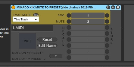 | Description: | Store PRESET of the FX Placed Just at the RIGTH OF THIS PATCH ------------------------------------------------------------ Select the Track you want OBSERVE the MUTE Live Track BUTTON to Link with PRESET 1 and PRESET 2 //////////////////////////////// attention Store Preset 1 of this PATCH before MUTE TRACK make sure have original State of FX in "Preset 1" //////////////////// exemple WHEN USE KIK TRACK AND YOU HAVE MORE TRACK WITH COMP SIDE CHAINED BY KIK when MUTE the KIK it's possible some TRACKS have " undesired GAIN or frequency UP Gain " ************************************ ********************************** This Patch made To EASLY EQUILIBRATE MIX WHEN ""réference Side Chain KIK " IS MUTE Or cool for Sound disign effect........ ************************** *********** Exp: when you MUTE THE KIK = a TRACK SYNTH have so More Energy 1- put an UTILITY (ableton) to TRACK SYNTH 2- put this PATCH just at the Left of UTILITY and select The TRACK ((KIK)) where Observe the MUTE TRACK BUTTON 3- make sure the KIK is unMuted (listen) and Store PRESET 1 it save the state of UTILITY on Preset 1 4- play the track and MUTE THE KIK 5- ajust UTILITY GAIN (of the SYNTH ) 6- Store PRESET 2 Now when the Mute / unMute the KIK alternate PRESET 2 / PRESET 1 you can repeat operation on a EQ to another Track ** Cool the MiX is auto Equilibrate when the KIK is MUTE and unMUTE ----------------------------------- now test with an EQU or disto , delay ....... ************* INFO the Patch Don't save All the Parameter in Effect Rack.. if a FX just at the Rigth iS an Ableton Effect Rack Only 8 macro is STORED |
