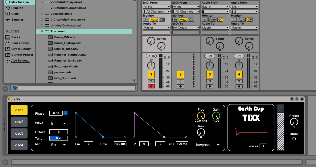 | Description: | Tixx by Earthdsp a flexible 4 Oscilators Drum Synth that can produce The Sounds of the vintage drum machine. It has 2 curve function envelopes that can be draw and curve to shape the sound easier. it can also be used to produce synth sounds such as Fm and substrative. polyphony can be set to play more voices but it will take also CPU. The envelopes can be used and curved with mouse drag + alt key. Midi can be fixed or frequency controlled. LFO can be achieved also as Fm by the other Oscilators. It's a unique design that will make it really easy to produce Electronic drums. Have fun ! version 1.1 Inital Patch Created Presets and store made the Fm algorithm better version 1.2 Fixed Error with patcher not found by freezing the device Added 12 basic presets version 1.3 fixed stuff with presets recall and restore version 1.4 Added Sound wenn device loads ! Ableton 10 Ready |
