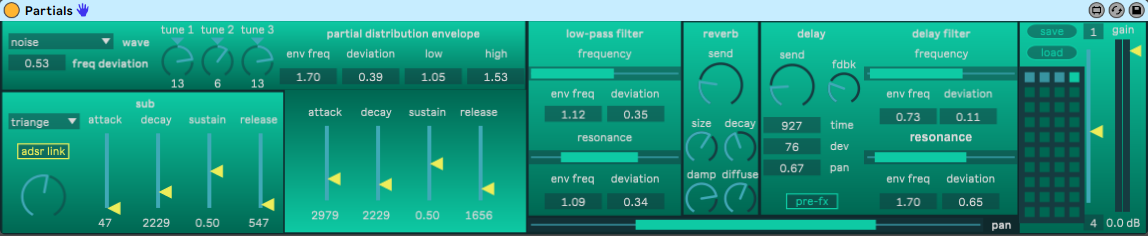 | Description: | Partials is a variable spectrum additive synthesiser with MC at its heart. Available as both a Max/MSP collective and Max for Live Instrument, the fundamental concept underpinning the design of Partials is one of variability and unpredictability. The foundation of the instrument is the ioscbank~ object and, specifically, the dynamic variation of the distribution of partials between the fundamental frequency and uppermost overtone, which can either be linear or increasingly logarithmic/exponential. Unfortunately, an MC variant of ioscbank~ does not exist so it was necessary to utilise poly~ to mimic the functionality of such an object. Partials comprises three additive voices, which operate in unison, and a sub oscillator. Parameter settings such as partial distribution, filter cutoff, and resonance are controlled by random envelope generators and fluctuate within a range of values as defined by rslider objects or number boxes. Random envelope frequency (the interval between newly generated envelope values) can be defined for each individual parameter, whilst deviation can be applied to create variation between the three unison voices. Download now includes: newly updated Max for Live Instrument with improved Ableton Live and Push integration; Max patcher; Max collective. |