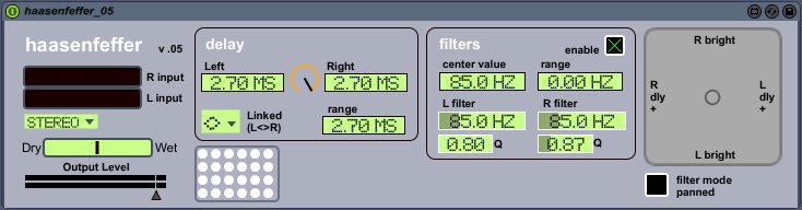 Haasenfeffer was inspired by the Haas effect (http://en.wikipedia.org/wiki/Haas_effect). You can use Haasenfeffer to add subtle adjustments to the perceived "space" of stereo or mono sound sources. Delay times can be panned, or set independently for each channel. The filter frequency is adjusted around a center value, and each filter can be linked or panned as well. The X-Y pad approximates a sonic space by adjusting the balance of delay times and filter levels. Automate the X-Y for some chorus type effects.