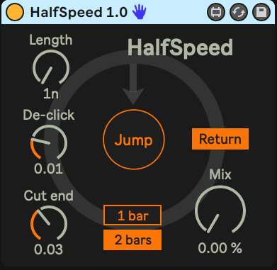 This is a basic half speed delay, up to two bars long, that can be set to return to the dry mix at the beginning of a bar, with a small adjustable cut at the end of the reverse to give it more punch. The delay has an adjustable declicking amount. The Jump button fades the mix quickly to half speed, great for performance. |