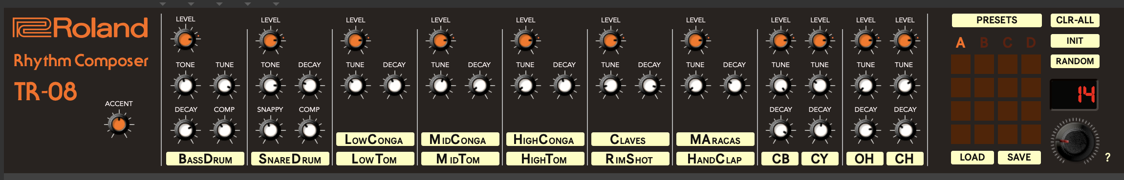 | Description: | TR-08 Remote Controller for Ableton Live with Max4Live with randomizer and 4 banks with 16 preset-slots. You can easily save various setting in 64 preset-slots and recall them via automation. Randomize values of all or a single instruments or reset them again vice versa. The Roland Logo is just to reflect the machine this device is build for. Roland is not involved in building this device. In case of bugs or feature requests or support, please contact me : switchbox@gmx.ch ...have fun ! v1.5 added support for slower midi devices with a speed limit control. changed some internal structure to clear it up. v1.6 Presets are now saved within Ableton's Live Set |