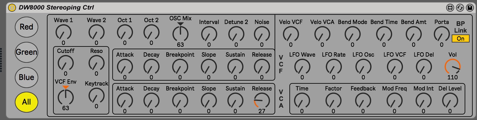 | Description: | This Device Controls the Stereoping Synth Controller with the DW8000 Firmware. This is NOT a controller itself for the DW8000, only for the Stereoping controller, to do automations, etc. I guess it explains itself, knobs sending CC Values, and bit of hiding action for the three modes. The BP Link (or Breakpoint Link) links the Sustain and Breakpoint Values, thus disabling the breakpoint and giving you normal ADSR Control. While linked, Slope is disabled. If you want to use this for a different Stereoping Controller Firmware, you could just rename a few knobs (and rearrange them in the "all" mode. Note: The "All" Mode uses a different set of linked knobs, so if you automate stuff do it either in the "All" page or on the "R/G/B" pages. Have Fun! |