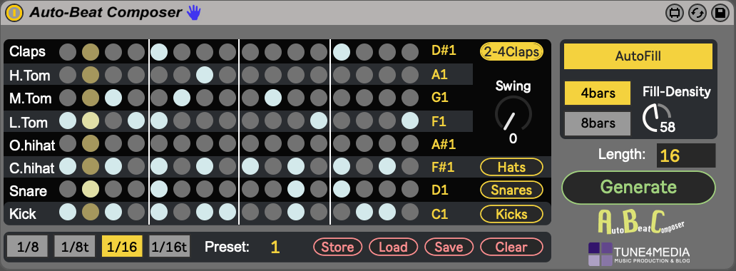 An automatic drum patterns generator. This drum sequencer is perfect for producers and live performance. If you're looking for something fresh, dynamic and a bit random, the A.B.C has it all. |