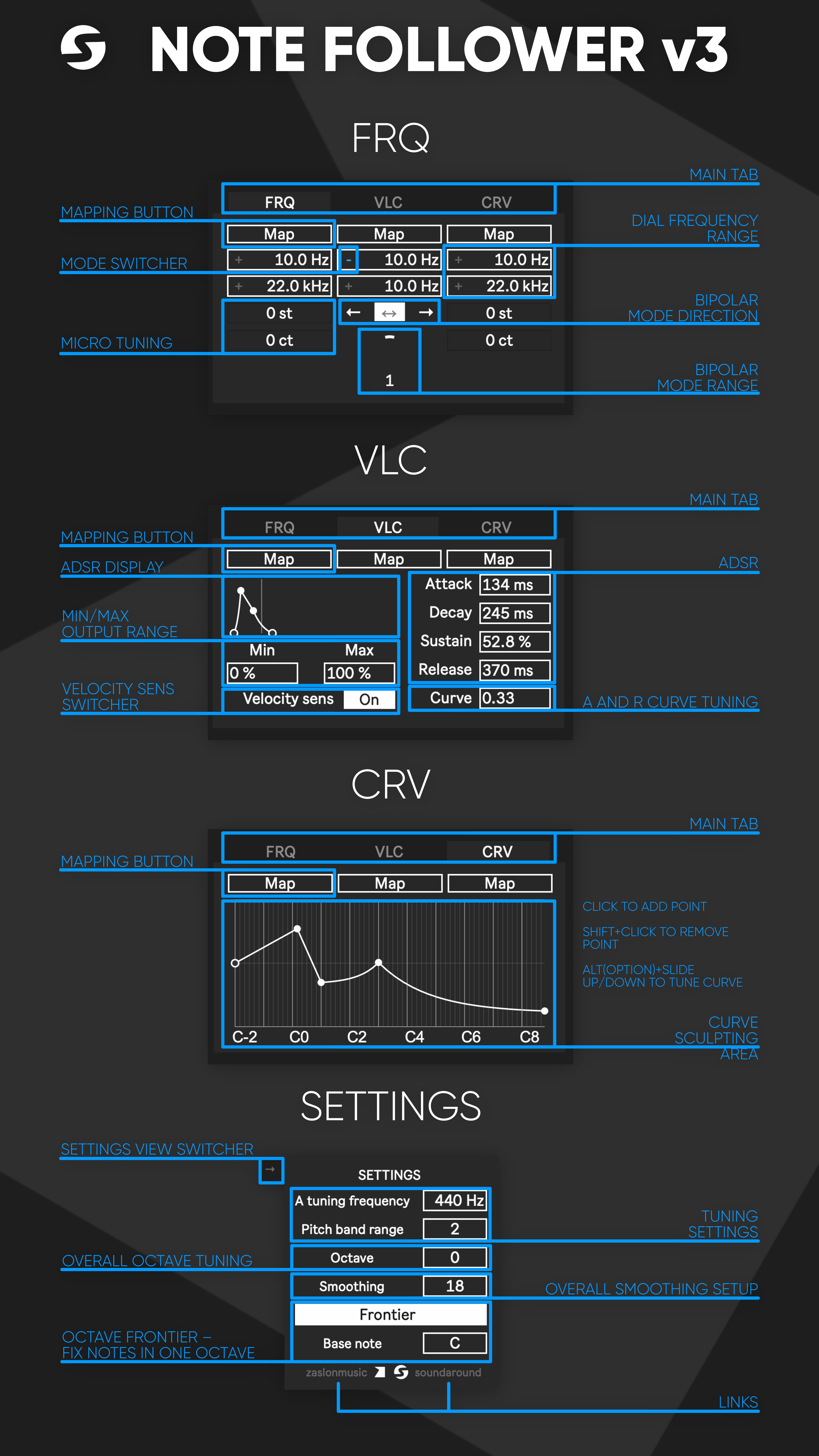 | Description: | Key tracking device Note Follower 3.1 converts incoming notes into frequency automation and lets you map that automation to any device, even a VST plugins. You are able to set the boundaries of the filter frequencies so that it coincides with the boundaries of the device. Also, you can shift octave or smooth automation. Pitch bend is also could change the automation (choose the PB value of your synth). Version 2 now supports negative values for the frequency range (use + switcher). Tested: Live 11 Live 10 Live 9 [with Max installed] (but slightly UI shifts) Previous version overview: https://youtu.be/6QKSTTm-gKk Changelog: v3.1 - Frequency range increased up to 40 kHz v3.0 - Updated UI - Separated Frequency map buttons - Curve mapping added (CRV tab) v2.6 - Velocity mapping added v2.5 - Live 9 compatibility improvements v.2.4 - Minor changes v 2.3 - UI redesign - Added "Note Frontier" that allows you to leave automation in one octave, also it's possible to set the Base note of the octave. v 2.2 - Testing v 2.1 - UI redesign - Added negative values switcher for frequency rage v 1.3 Bugfixes: - Map button is resetting its state after Set reloading - fixed - Automation jumps to the previous note when the current note send off - fixed v 1.2 - Pitch bend support added - Performance improvements v 1.1 - The first public release |