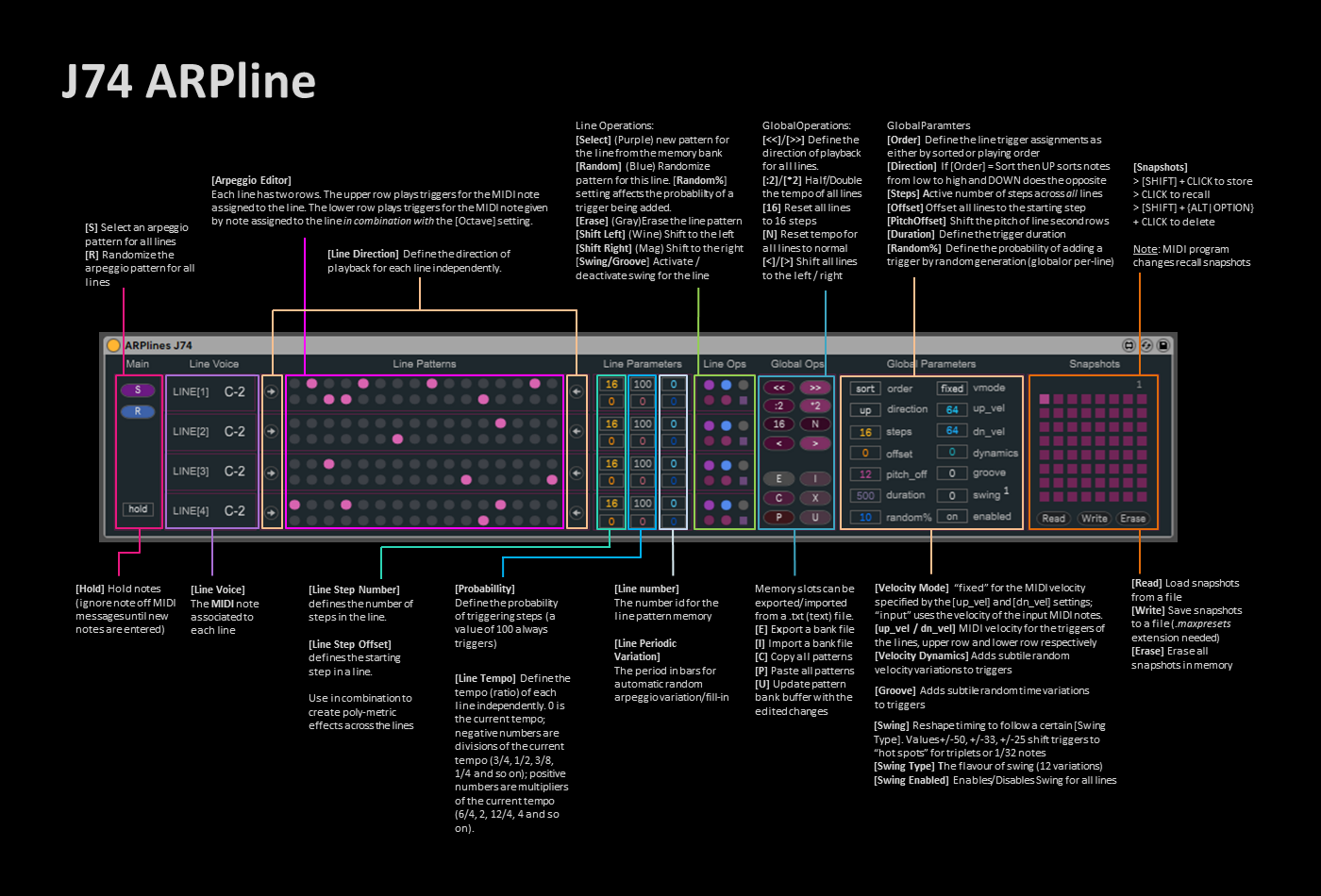 | Description: | J74 ARPline is an arpeggiator plugin for Ableton Live. With a lot of flexibility. At its heart it is composed of four independent lines, each one capable of the same features. A line is a programmable pattern for triggers and has its own controls for step number, step offset, playback direction, speed, signature, probability and more. When settings are combined across the lines, these features allow you to create complex poly-metric and/or poly-rhythmic arpeggio's. - Fully programmable arpeggiator with four independent lines - Random generation, globally and for each line separately - Random mixing for new combinations - Line Step Number and Step Offset for poly-metric playback - Line independent Speed for poly-rhythmic combinations - Line Direction and Trigger Probability - Line pattern shift left/right (per line) to allow syncopation - Periodic random pattern changes, for each line independently - Global Step Number and Step Offset for syncopated playback - Pattern memory slots - Pattern mixing for up to 15,000 different combinations - Pattern presets: save and recall on the fly your own patterns - Snapshots: save and recall snapshots of the entire device - Groove/Dynamic effect (timing and velocity for humanized feel) - Swing effect, with 12 modes including MPC-like swing Youtube tutorial: https://www.youtube.com/watch?time_continue=3&v=rNEiQ7ncuqw Webpage: http://fabriziopoce.com/arpline.html |