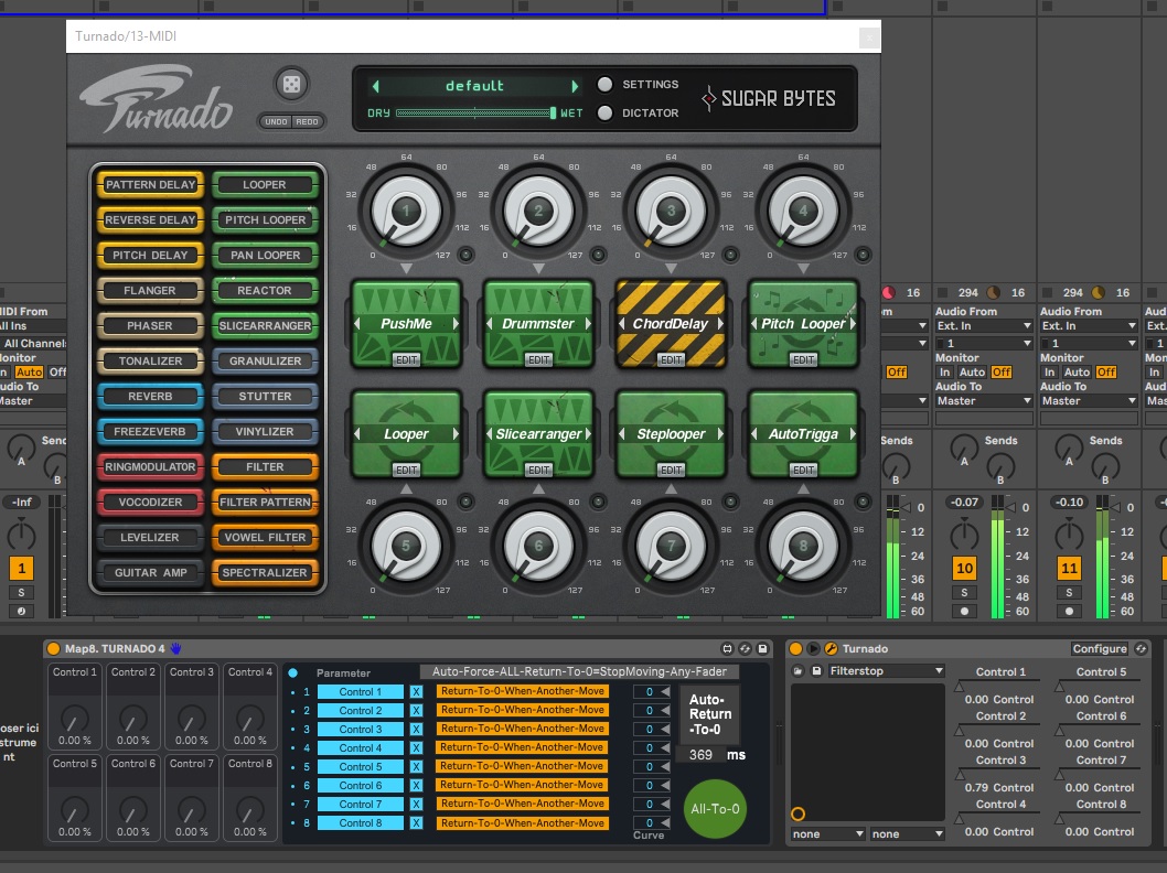 | Description: | Utility for Sugar Bytes TURNADO used as momentary Break FX with Looper and slice arranger Preset Cool if use only 8 different preset of Slice Arranger of turnado Moving one fader auto return to zero all other Because a Turnado Slicer need Fader return to Zero to take news buffer i make this patch to all 8 Macro return to zero when another is move And Now with 8 Push Macro you play direclty Wtih 8 different preset of Turnado Slicer Arranger Cool to generate momentary break ------------ Map 8 Macro to 8 FX fader of Turnado --------------------------------------- you can desativate Return to Zero for one reverb if needed --------------------- Button Auto return put 360 ms force return All to zero when Stop Moving a Fader -------------------------------------- |