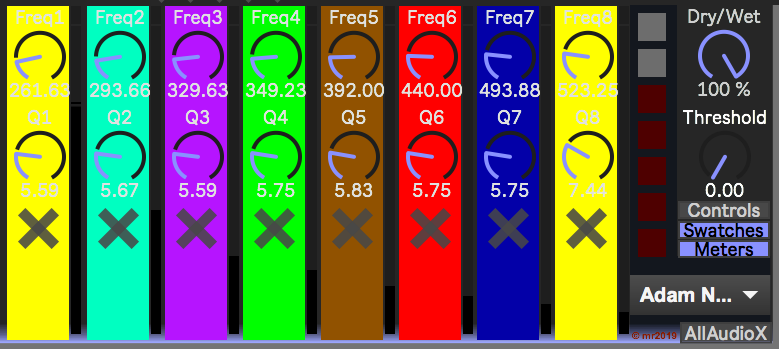 | Description: | AUDcolours maps frequencies to colours. There are eight vertical bars which can display any colour when any frequency from 10 Hz to 10 kHz is input (each bar has a band-pass filter, the bandwidth of which can be set using the Q control). Preset mappings are provided for human chakras and for musical notes (CDEFGABC). Controls in the vertical bars allow the centre frequency of the band-pass filter to be set, the width of the band-pass filters to be set (Q or resonance), if the audio from that band-pass filter is passed to the output (X), and a colour swatch that sets the background colour of the bar. The threshold of triggering of the vertical bars can be set by a 'Threshold' rotary control. Meters are provided to make setting the audio input easy. Seven additional preset memory slots are provided for your own frequency-to-colour mappings. A Wet/Dry control allows selection between the input and the outputs of the band-pass filters. Toggle switches control the shown/hidden status of the rotary controls, the audio meters and the colours swatches in the vertical bars. This is an early prototype produced in response to a query on the Facebook 'Ableton Live' group. It may not be perfect! My usual process is to release early, and fix later... The spelling of the word 'colour' follows UK convention. If there are sufficient downloads, then a synonymous 'AUDcolor' following US spelling convention can be published. Version 0.2 adds a selector box so that additional colour scheme presets can be added. The first of these follows Adam Neely's 'synaesthesia' colours as described in his YouTube blog recently... |