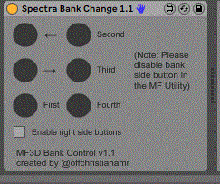 | Description: | This utility allows you to use the rubber buttons on the side of the Midi Fighter 3D to change banks, similar to the Midi Fighter Spectra. To use, set the track monitoring to in and make the MIDI output to the Midi Fighter 3D on channel 4. Also remember to disable "Bank Side Button" in the Midi Fighter Utility. The top button on the left switches the bank forward and the middle left button switches the bank back. The bottom left switches to the first bank, and the buttons and the right side switch to the second, third, and fourth banks as long as the "Enable right side buttons" switch is toggled. Unfortunately, the Midi Fighter 3D firmware does not allow the lights to update fast enough to recreate the animation used on the Spectra. IMPORTANT NOTE: After loading the Max For Live device into your set, press one of the bank buttons on the Midi Fighter. The device will not work unless you do this. Hopefully I can find a fix for this soon. Enjoy! |